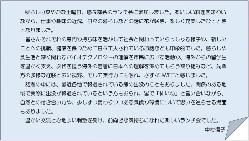悠々部会では外出するのに快適な時期(春・秋)にランチ会を開催しています。今年2回目のランチ会を11月1日(土)に東京駅直結の大丸東京店12階にある「ブラッスリー・ポール・ボキューズ」で開催しました。9名の参加があり、和やかでありながらも多様な話題に事欠かない充実した時間を過ごしました。参加すれば何か持ち帰るものがあるランチ会を継続していきたいと思います。